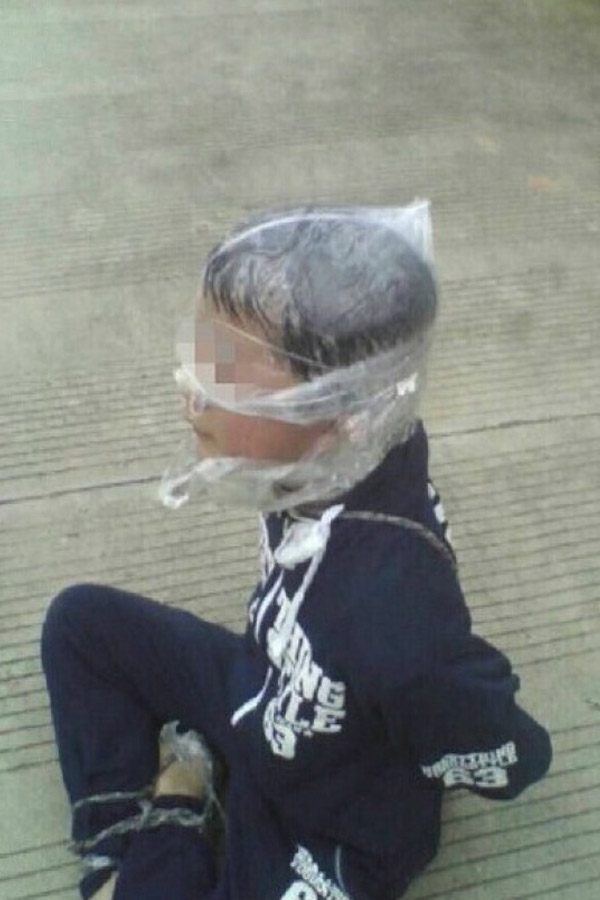 Tiểu Dịch bị tên bắt cóc trói lại và bịt đầu bằng túi nilon