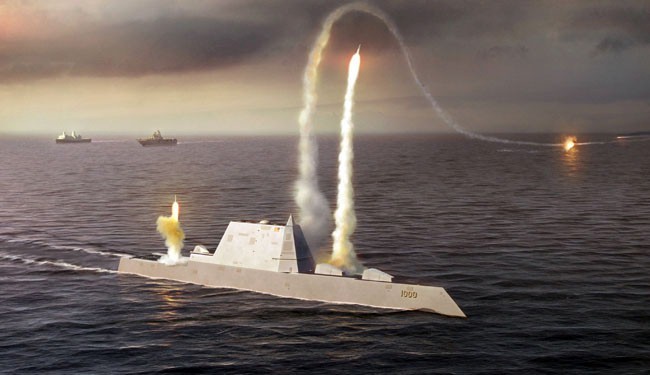 Mô phỏng quá tŕnh tấn công của tàu khu trục tàng h́nh lớp Zumwalt, tàu chiến mặt nước hiện đại nhất thế giới của Mỹ. Ảnh: US Navy