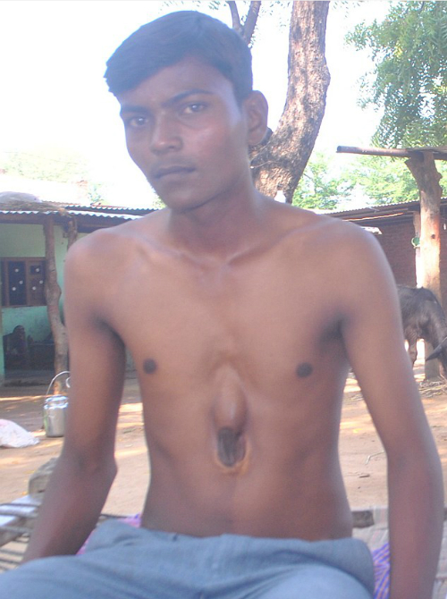 VBF-Bị di tật tim nằm không đúng vị trí như thế này khả năng sống xót là rất ít vậy mà người thanh niên này đã sống với nó suốt 18 năm nay. Hiện sức khoẻ của anh này là hoàn toàn bình thường là điều mà các bác sĩ kinh ngạc nhất.Theo Daily Bhaskar, hội chứng ectopia cordis (tim lạc chỗ) khi chào đời khiến Arpit Gohil được bác sĩ chẩn đoán sẽ khó sống nổi. Chỉ cần một cú ngã hay vết sưng nhỏ cũng có thể khiến cậu bé mất mạng. Quả tim của Arpit Gohil nằm bên ngoài lồng ngực, được bao bọc bởi một làn da mỏng manh. Hội chứng hiếm gặp của Arpit được ghi nhận chỉ khoảng 165 trường hợp trên toàn thế giới.Vượt ngoài mọi dự đoán, Arpit lớn lên như bất kỳ các cậu bé khác cùng trang lứa. Cậu vẫn trèo cây, lái xe máy kéo trên 40 km nông trại của cha mình tại Ahmedabad, bang Gujarat, Ấn Độ. "Tôi có thể làm tất cả mọi thứ như một người bình thường. Không có bất kỳ rắc rối với công việc trên nông trại như cày xới đất, lái xe máy kéo hay đạp xe đạp", chàng trai sinh năm 1997 chia sẻ.