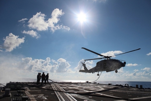 Hai trực thăng MH-60R Sea Hawk đi theo tàu là những máy bay thường xuyên đảm nhận nhiệm vụ tuần tra trên Biển Đông.