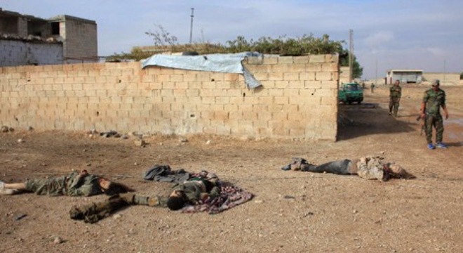 Lực lượng ủng hộ Chính phủ Syria bên thi thể các tay súng được cho là phiến quân IS tại thị trấn Safireh sau giao tranh ngày 28/10.