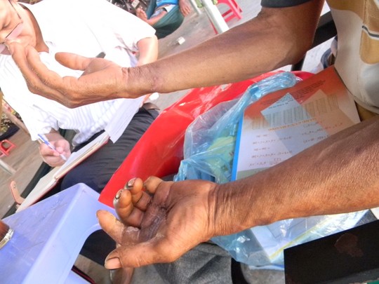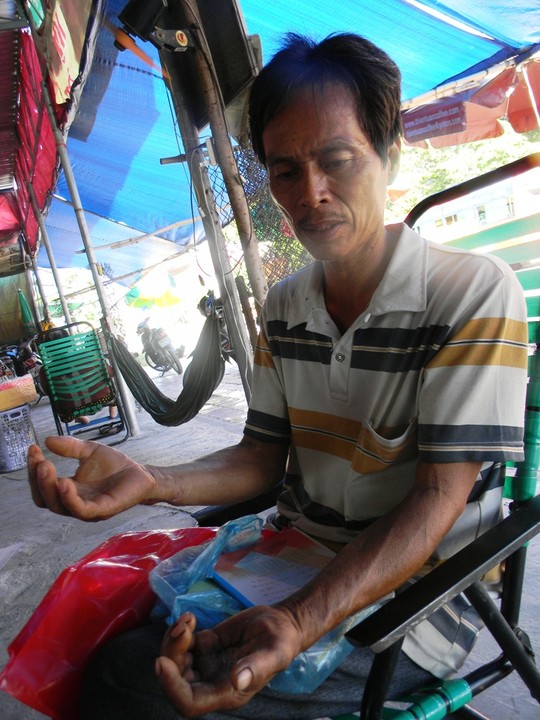 Hai tay của ông Thư với nhiều vết khâu chằng chịt do bị chém, riêng ngón út tay trái đã bị đứt lìa, không thể nối lại.