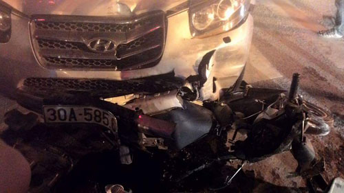 Cú va chạm khiến người đàn ông điều khiển xe máy bị văng ra xa, còn người phụ nữ ngồi sau xe máy bị ô tô Santafe 7 chỗ cuốn vào gầm, kéo đi. Chiếc xe ô tô Santafe chỉ dừng lại khi đâm vào cột đèn tín hiệu giao thông ở ngã tư.
