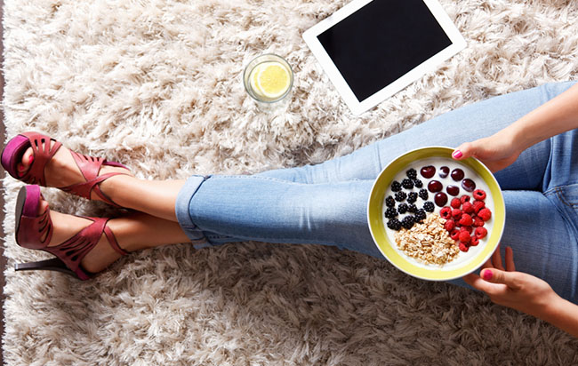 Bữa sáng là bữa ăn quan trọng nhất trong ngày. Bữa sáng đủ đầy dinh dưỡng sẽ giúp tăng cường sự trao đổi chất trong cơ thể, từ đó chất béo được chuyển hóa thành năng lượng nhanh hơn, lượng mỡ thừa cũng đốt cháy nhiều hơn. Một bữa ăn sáng thịnh soạn đúng nghĩa có khả năng giữ loại hormoen ghrelin (hormone đói) ở mức ổn định. Bạn có thể lựa chọn trứng cho bữa sáng của mình. Trứng nhiều dinh dưỡng, giúp bạn no đến tận trưa mà không gây tích mỡ. Nên nhớ không bao giờ bỏ bữa sáng, dù vì bất cứ lý do gì.