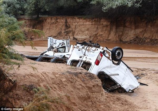 Hai chiếc xe tải bị cuốn trôi theo lũ quét tại Utah hôm thứ 2 vừa qua (ảnh: Getty Images)