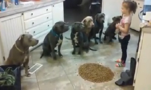 Cô bé đổ đầy thức ăn ra sàn mà 6 chú chó chỉ biết nhìn theo cho đến khi được lệnh mới dám ăn. Cô gái bé xíu nhưng có thể huấn luyện được cho những chú chó to đùng này biết ăn theo mệnh lệnh quả thực là rất giỏi. Hãy cùng vietbf khám phá nhé!