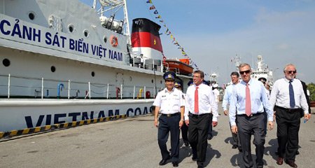 Bộ trưởng Quốc phòng Mỹ Ashton Carter thăm tàu cảnh sát biển 8003 tháng 6/2013 tại Hải Phòng. Ảnh: Đức Hạnh