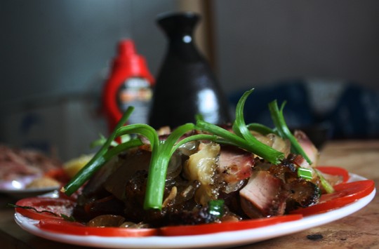 Sau một ngày lao động vất vả, mẹ thường lấy thịt treo ra nấu. Thịt được ngâm vào nước nóng cho mềm cả phần nạc, mỡ vào da khô. Sau khi rửa sạch, mẹ thái thành từng miếng thật mỏng. Mẹ xào thịt với rau cải, với lá tỏi tươi… món nào cũng rất ngon.