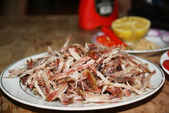 Thỉnh thoảng nhà có khách uống rượu, mẹ lấy một miếng thịt nguyên nạc rửa sạch rồi nướng trên than củi. Mẹ dùng chày nhỏ đập nhẹ rồi xé thịt thành từng thớ dài. Thớ thịt lợn không dài và dai như thớ thịt trâu nhưng vị ngọt thì hơn hẳn. Hơn nữa, thịt lợn không có vị gây của trâu, được tẩm ướp nên rất thơm.