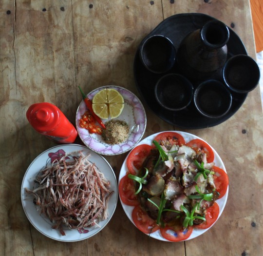Bố và khách ngồi uống rượu bên bếp lửa. Những câu chuyện về mùa vụ, về chuyện học hành của chúng tôi được kề cà đưa đẩy. Tôi ngồi bên hóng chuyện. Mỗi lần nhấp chén, bố lại đưa cho tôi một sợi thịt khô.