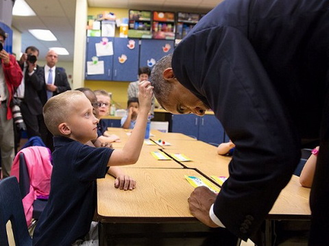 Obama để học sinh lớp 1 Edwin Caleb vuốt vào tóc của mình trong chuyến thăm Trường tiểu học Clarence Tinker tại căn cứ không quân MacDill ở Tampa, Florida vào ngày 17/9/2014