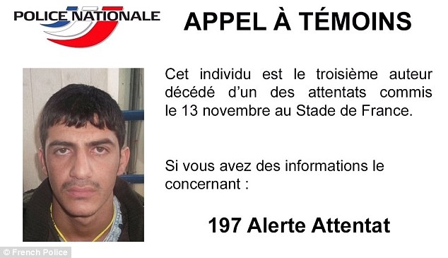 Cảnh sát Pháp đã công bố hình ảnh kẻ khủng bố thứ 3 trong vụ đánh bom tự sát tại SVĐ Stade de France nhằm tìm kiếm thông tin chi tiết về tên này.
