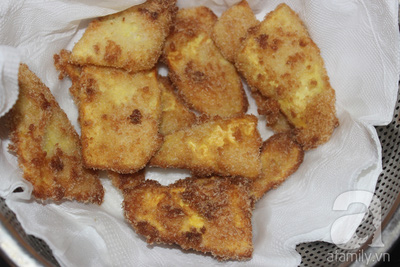 Đợi cho miếng khoai vàng đều hai mặt thì gặp ra để lên giấy thấm dầu cho ráo. Ăn nóng.