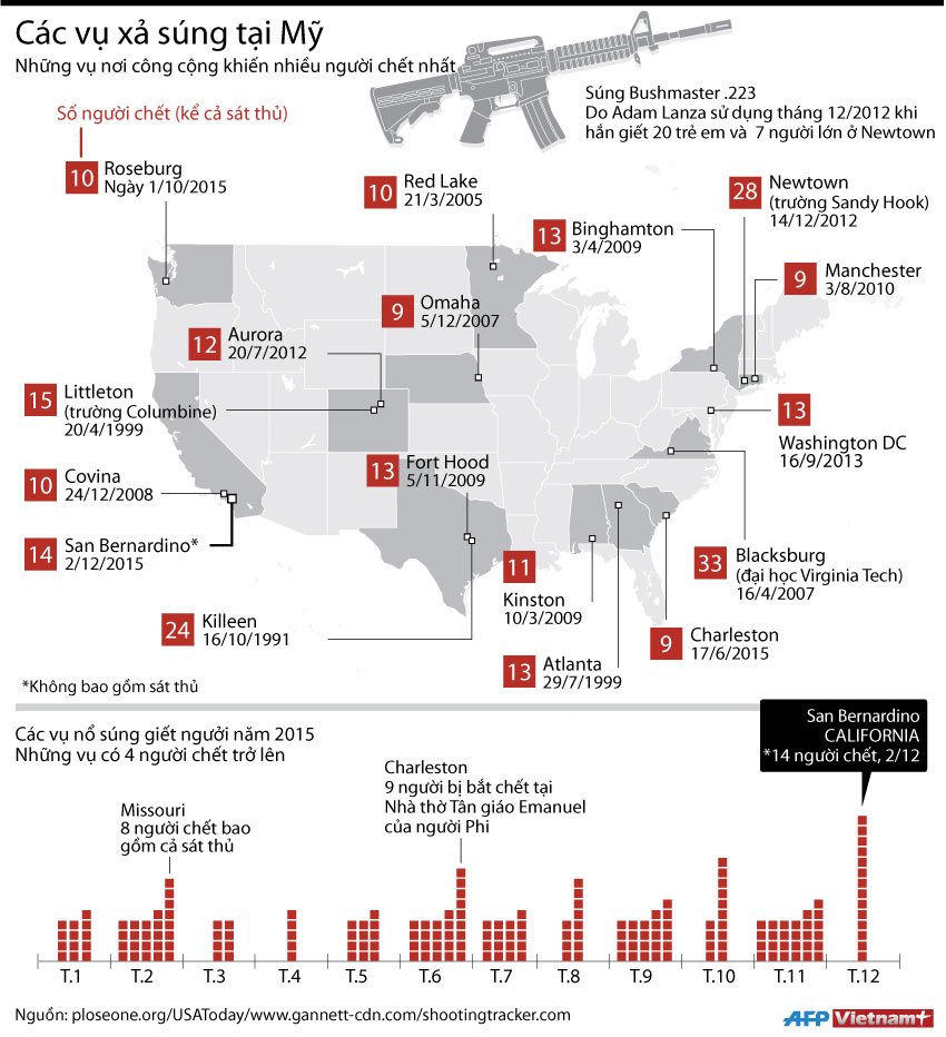 Như chúng ta đã biết, vào trưa 2/12 (theo giờ địa phương) đã xảy ra một vụ xả súng ở thành phố San Bernardino thuộc Tây Nam bang California, khiến ít nhất 14 người thiệt mạng và 17 người bị thương. Tuy nhiên nếu nhìn lại những vụ xả súng ở nước này thì đây chưa phải vụ nghiêm trọng nhất! Nhiều người sẽ phải rùng mình khi nhìn vào biểu đồ dưới đây!