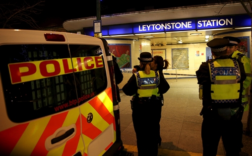 Cảnh sát Anh tiếp cận hiện trường vụ đâm dao ở ga tàu điện ngầm Leytonstone, đông London. Ảnh: Reuters.