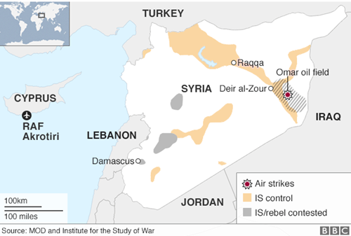 Mỏ dầu Omar là mục tiêu tấn công của máy bay Anh (Đồ họa: BBC)