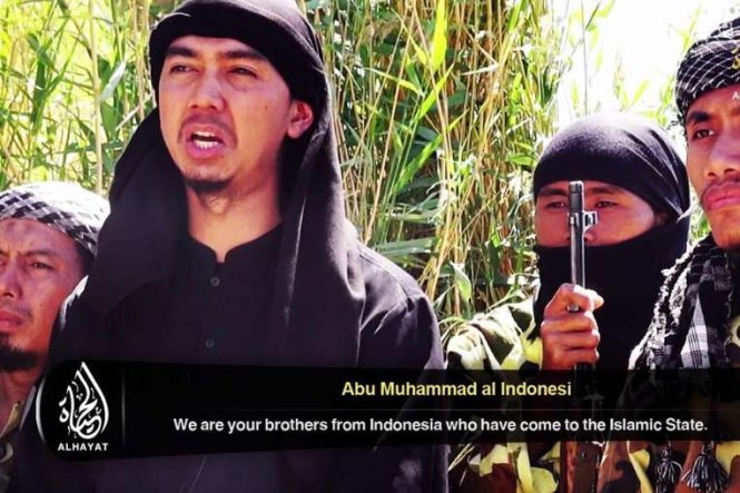 Một nhóm người Indonesia xuất hiện trong đoạn phim do IS tung ra nói rằng những người này đã gia nhập IS - Ảnh:Straits Times