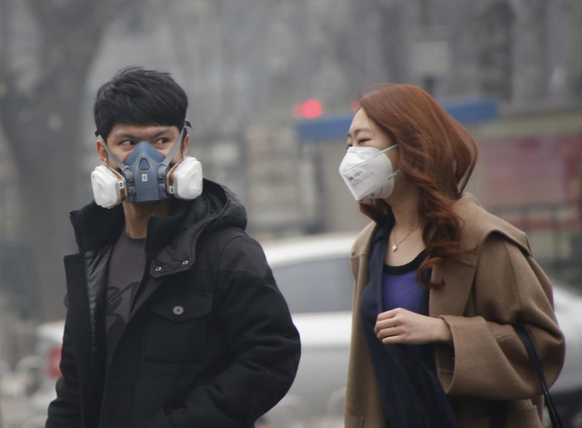 Một cặp đôi đeo khẩu trang kín mít để tránh hít phải không khí ô nhiễm trong ngày Bắc Kinh phát "báo động đỏ" về ô nhiễm ngày 8.12.