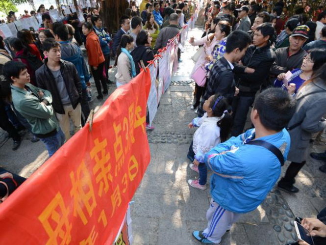 Những người đàn ông nông thôn Trung Quốc đang cùng cha mẹ đến xem quảng cáo "môi giới hôn nhân" ở Nam Kinh - Ảnh: news.com.au