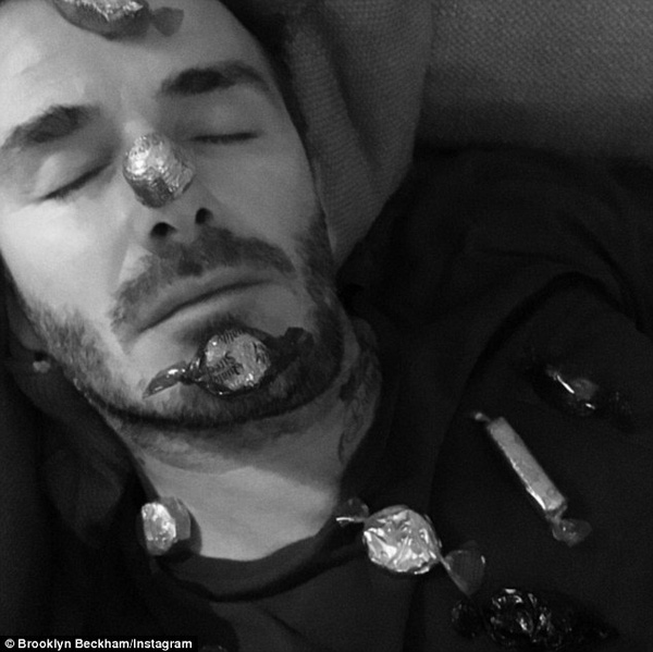Khi Beckham ngủ, anh bị con trai cưng bầy kẹo la liệt trên mặt rồi chụp ảnh khoe với các fan. "Bắt được bố đang ngủ nhé", Brooklyn bình luận vào bức ảnh.