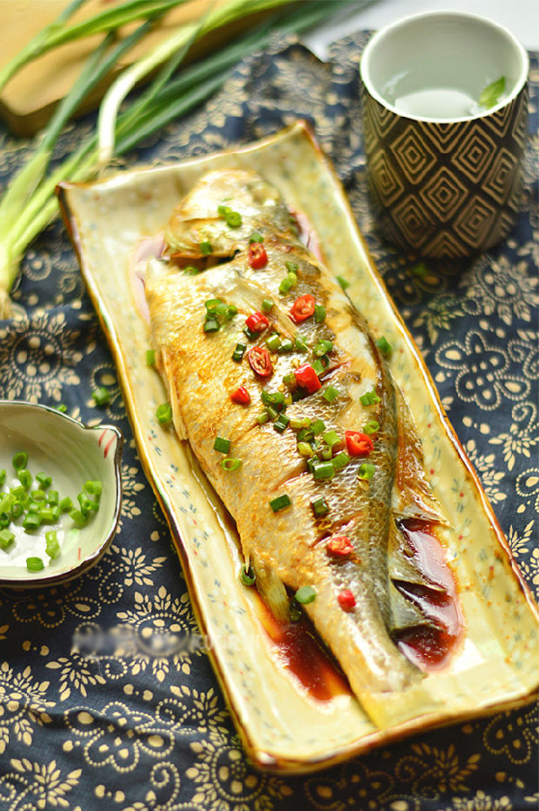 Cá chín, bạn đặt cá lên đĩa hình chữ nhật, rắc hành lá và ớt cắt nhỏ lên trên thân cá. Tiếp theo, bạn rưới nước tương lên trên con cá.