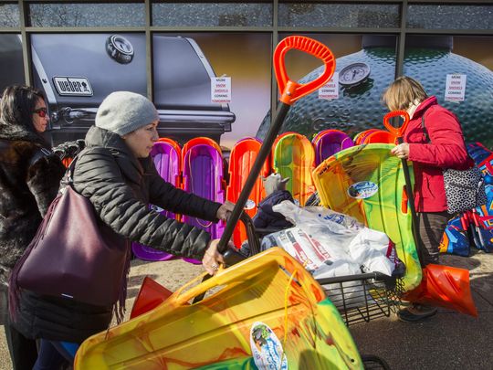 Người dân mua sắm gậy xúc tuyết chuẩn bị cho bão. Ảnh: European pressphoto agency.