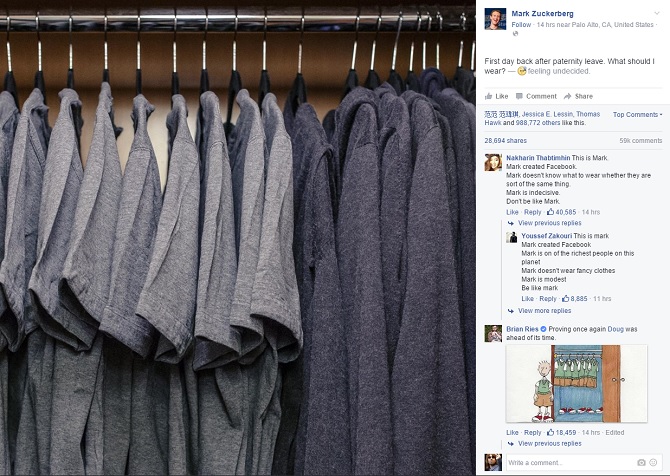 Hiện tại, bức ảnh của Zuckerberg đã thu hút được hơn 980.000 lượt Like và hơn 28.600 lượt chia sẻ. Các bình luận hàng đầu đều tỏ ra khá hài hước, ví dụ như "Cái áo thứ 3 từ bên phải nhìn đẹp nhất" hoặc "50 sắc thái xám… Hi Mark, đừng làm việc mệt mỏi quá nhé". Bình luận số 1 (với gần 41.000 lượt Like) là ấn tượng hơn cả: