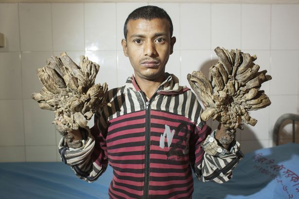 Bị nhiễm một loại vi rút có tên gọi HPV, chàng trai Abul Bazadar (25 tuổi) khốn đốn khi bàn tay và bàn chân của mình nhìn như rễ cây. Cả tay và chân của anh đều xù xì, cứng chắc và có “rễ” đâm ra tua tủa khiến cuộc sống của anh trở nên vô cùng khó khăn.