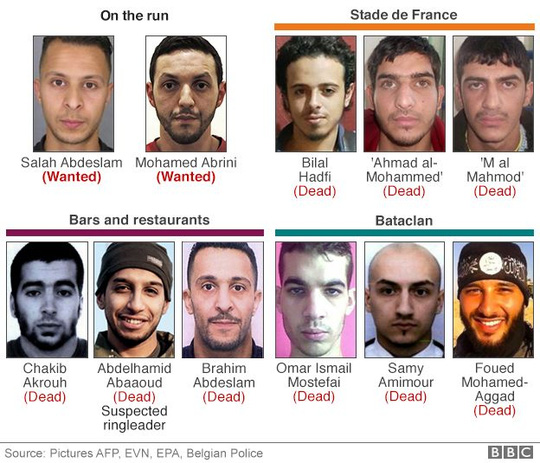 Từ trái qua phải, từ trên xuống dưới: Nhóm khủng bố bỏ trốn, nhóm tấn công bên ngoài sân vận động Stade de France, nhóm tấn công quán cà phê nhà hàng, nhóm tấn công nhà hát Bataclan. Ảnh: BBC