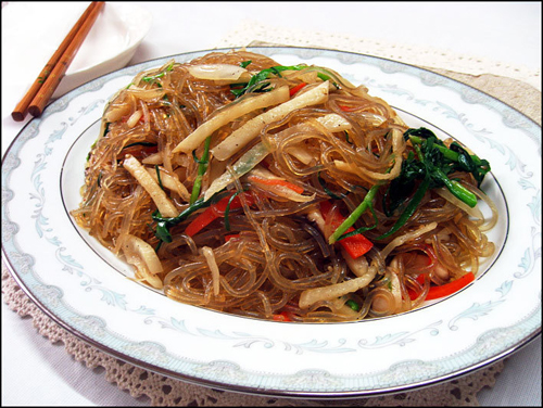 Japchae làm từ mì, xào với rau, thịt bò, nước tương, đường và dầu vừng. Tùy vào sở thích bạn có thể thưởng thức nóng hoặc lạnh.