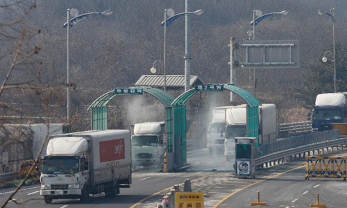 Các xe của Hàn Quốc rời khỏi Kaesong hôm nay. Ảnh: AFP