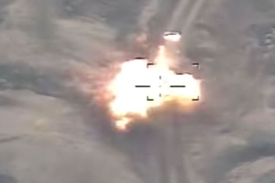 Các xe tải chở dầu của IS bị không kích. Ảnh: Youtube