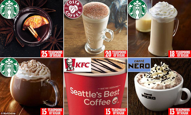 Còn một cốc lớn mocha của KFC có 58,8g - 15 thìa đường - trong khi một cốc Caramelatte của chuỗi cửa hàng Caffè Nero, người ta đo được 50,6g - 13 thìa đường.