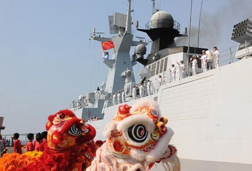 Campuchia cho cả đội múa lân ra đón 3 chiến hạm Trung Quốc cập cảng Sihanoukville, ảnh: China.org.cn.