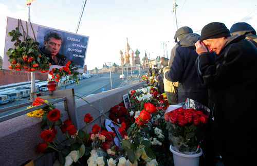 Những người ủng hộ đặt hoa và cầu nguyện tại địa điểm ông Nemtsov bị ám sát ở Moscow. Ảnh: Reuters