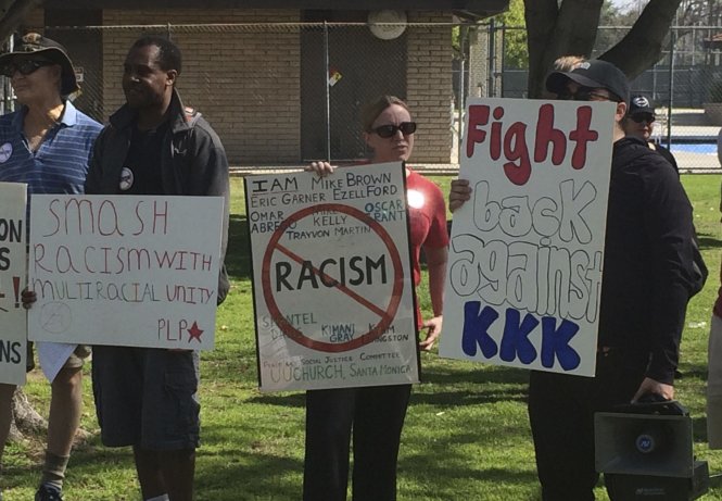 Người biểu tình phản đối KKK ở California ngày 27-2 - Ảnh: Reuters