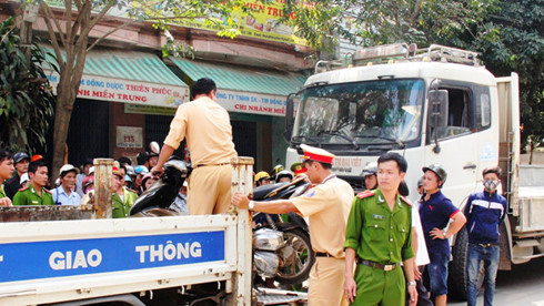 Tại hiện trường, vết thắng dài tạo thành vệt trên đường, chiếc xe máy bị kéo lê khoảng 30m hư hỏng nặng nằm kẹt dưới đầu xe tải, phải dùng máy nâng mới lấy được ra ngoài. Bé Hiền khóc nức nở khi nhìn thấy mẹ và chị đã chết.