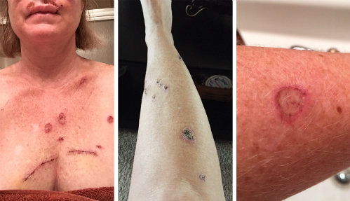 VBF-Ung thư da là 1 trong những loại ung thư nguy hiểm xong nó lại được mọi người xem như là không dễ mắc nên ít ai đề phòng. Như người phụ nữ này cũng chính vì chủ quan mà mắc phải căn bệnh này.Liên tục tiếp xúc với ánh nắng mà không tự bảo vệ, Judy Cloud 49 tuổi (Mỹ) bị ung thư da và quyết định chia sẻ tác động của căn bệnh đến cơ thể nhằm cảnh báo cộng đồng.Tổng cộng, Cloud có 23 điểm ung thư trên mặt, ngực, cánh tay, bắp chân và phải chi 27.000 USD để phẫu thuật. Vừa trải qua ca mổ thứ tư, cô thừa nhận đây là hậu quả của việc nhuộm da thường xuyên và không dùng kem chống nắng.Theo Self, Cloud dành rất nhiều thời gian ngoài trời. Từ tuổi 20, cô nhuộm da 4 lần mỗi năm. Trong gia đình có người bị ung thư, Cloud vẫn chủ quan cho rằng mình không thể mắc bệnh.