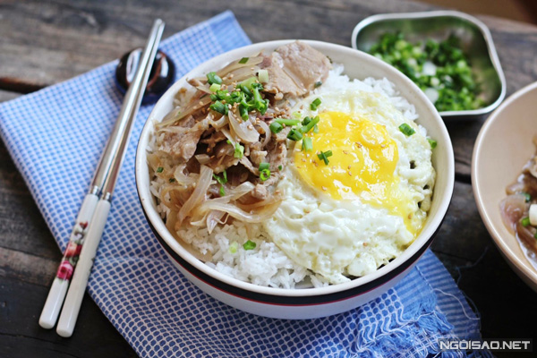 - Thêm 250 ml nước dùng gà, 3 muỗng nước tương, 1 muỗng bột nêm, 1/2 muỗng tiêu nấu trên lửa lớn. Khi nước đã hơi sánh tắt bếp cho thịt ra đĩa, rắc hành lá thái nhỏ dùng chung với cơm.