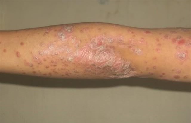 Biểu hiện của bệnh vảy nến có rất nhiều nhưng đầu tiên dễ nhận biết là thương tổn da: Hay gặp và điển hình nhất là các dát đỏ có vẩy trắng phủ trên bề mặt, vẩy dày, có nhiều lớp xếp chồng lên nhau rất dễ bong và giống như giọt nến (Vì vậy có tên gọi là “Vẩy nến”). Kích thước thương tổn to nhỏ khác nhau với đường kính từ 1- 20 cm hoặc lớn hơn.