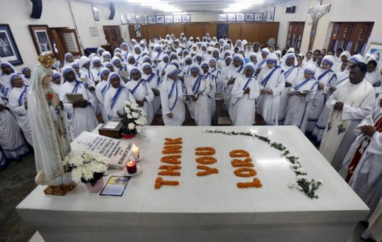 Các nữ tu của dòng Thừa Sai Bác Ái tham dự một buổi lễ tại mộ của Mẹ Teresa ở TP Kalkota - Ấn Độ hôm 15-3. Ảnh: REUTERS