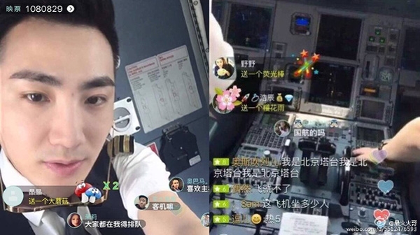 Một anh chàng phi công đẹp trai người Trung Quốc đã thu hút hơn 64.000 lượt theo dõi trên Weibo nhờ việc phát sóng trực tiếp (live broadcasting) ngay trong buồng lái trên các chuyến bay của mình. Cụ thể, anh chàng đã quay cận khuôn mặt của mình, chi tiết trong buồng lái, cách thức lái... ngay trong giờ làm việc - tức... đang bay lơ lửng trên bầu trời.