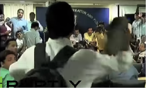 Trong buổi họp báo đang diễn ra suôn sẻ, Chủ tịch Hội đồng Bộ trưởng Delhi, Ấn Độ đã suýt “hứng trọn” chiếc giày của một người dân đứng đó. Mặc dù vị quan chức này chưa bị giày bay vào người nhưng hành động này đã khiến ông trở thành chính trị gia ê chề nhất trên thế giới.