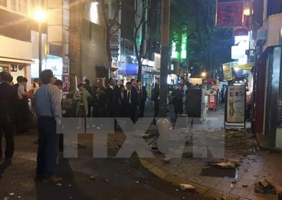 Người dân đổ xuống đường phố do lo ngại dư chấn sau động đất ở thành phố Kumamoto ngày 14/4.