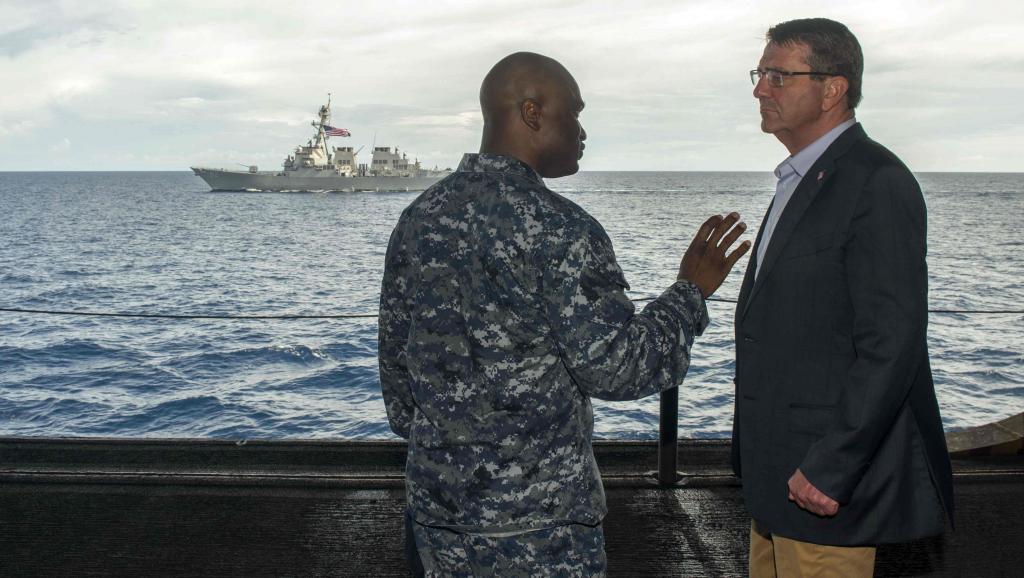 Vì ngày 15/04/2016, bộ trưởng Quốc Phòng Hoa Kỳ Ashton Carter đã ra thăm một chiếc tàu sân bay Mỹ đang quá cảnh vùng Biển Đông đang tranh chấp giữa Trung Quốc và các láng giềng. Trong một động thái mang ý nghĩa rõ rệt, Bắc Kinh cũng loan báo sự kiện một lãnh đạo quân sự cao cấp Trung Quốc vừa đi thị sát một hòn đảo trên Biển Đông, để giám sát công tác xây dựng.