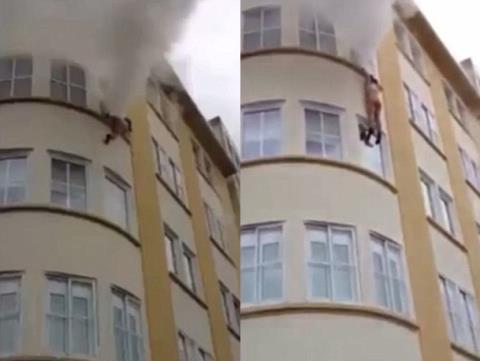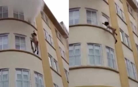 Trong tình trạng bán khỏa thân, chỉ mặc mỗi bộ đồ lót trên người, người phụ nữ này đã liều mình nhảy ra ngoài cửa sổ để khỏi bị chết ngạt. Cô bám víu một cách nguy hiểm bên vách cửa sổ.