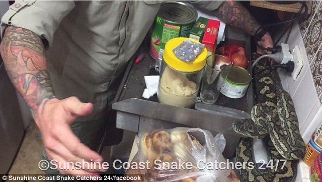 Vụ việc xảy ra tại Sunshine Coast, Queensland, Australia. Chủ nhà đã lạnh toát cả người khi phát hiện ra một con trăn đang nằm im, bụng trương phình sau lò vi sóng và đang ngủ. có vẻ con này vừa nuốt trọn một con mèo. Chủ nhà đã phải vội thông báo nhờ sự giúp đỡ khản cấp.