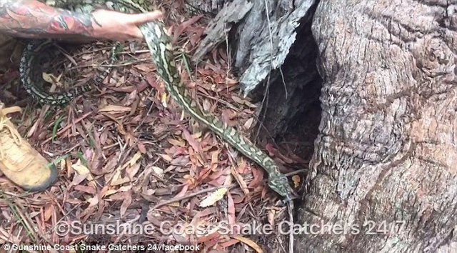 Nhân viên bắt rắn Ross McGibbon từ trung tâm cứu hộ Sunshine Coast đã có mặt và xử lý con trăn. Ross cho biết con trăn vừa được một bữa no khi quan sát thân hình phình to của nó.