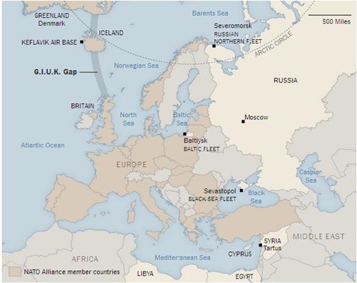 Theo New York Times, các sĩ quan tại trung tâm chỉ huy chiến dịch ở châu Âu của hải quân Mỹ lần đầu tiên trong nhiều thập kỷ đã phải theo dõi sát các hoạt động của tàu ngầm Nga qua những nút thắt quan trọng chia cắt Greenland, Iceland và Anh. Đây là những địa điểm có ý nghĩa chiến lược đối với mạng lưới bảo vệ châu Âu thời kỳ Chiến tranh Lạnh. Rộng khoảng vài trăm km, khu vực này là lằn ranh mà Liên Xô phải vượt qua nếu muốn tới Đại Tây Dương và ngăn cản các lực lượng Mỹ hợp quân với đồng minh châu Âu trong những giai đoạn khủng hoảng.