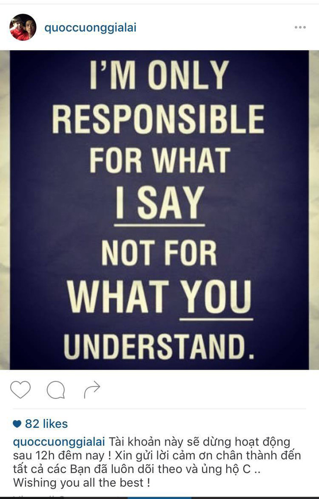 Trong khi đó, trang Instagram của anh cũng viết thông báo với nội dung tương tự: ""Tài khoản này sẽ dừng hoạt động sau 12h đêm nay! Xin gửi lời cảm on chân thành đến tất cả các bạn đã luôn theo dõi và ủng hộ Cường. Wishing you all the best!".